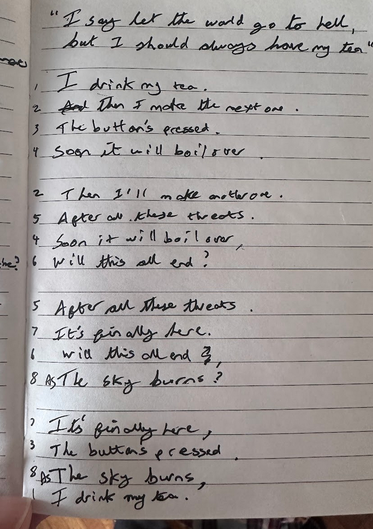 I decided I'd take the idea of simple phrases repeated and write a Pantoum.