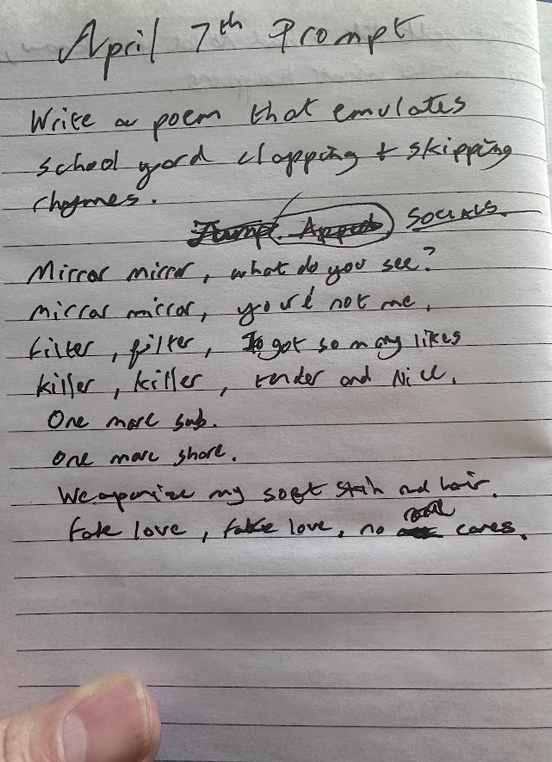 Today's prompt from https://www.napowrimo.net/ is: write a poem that emulates school yard clapping or skipping rhyme.