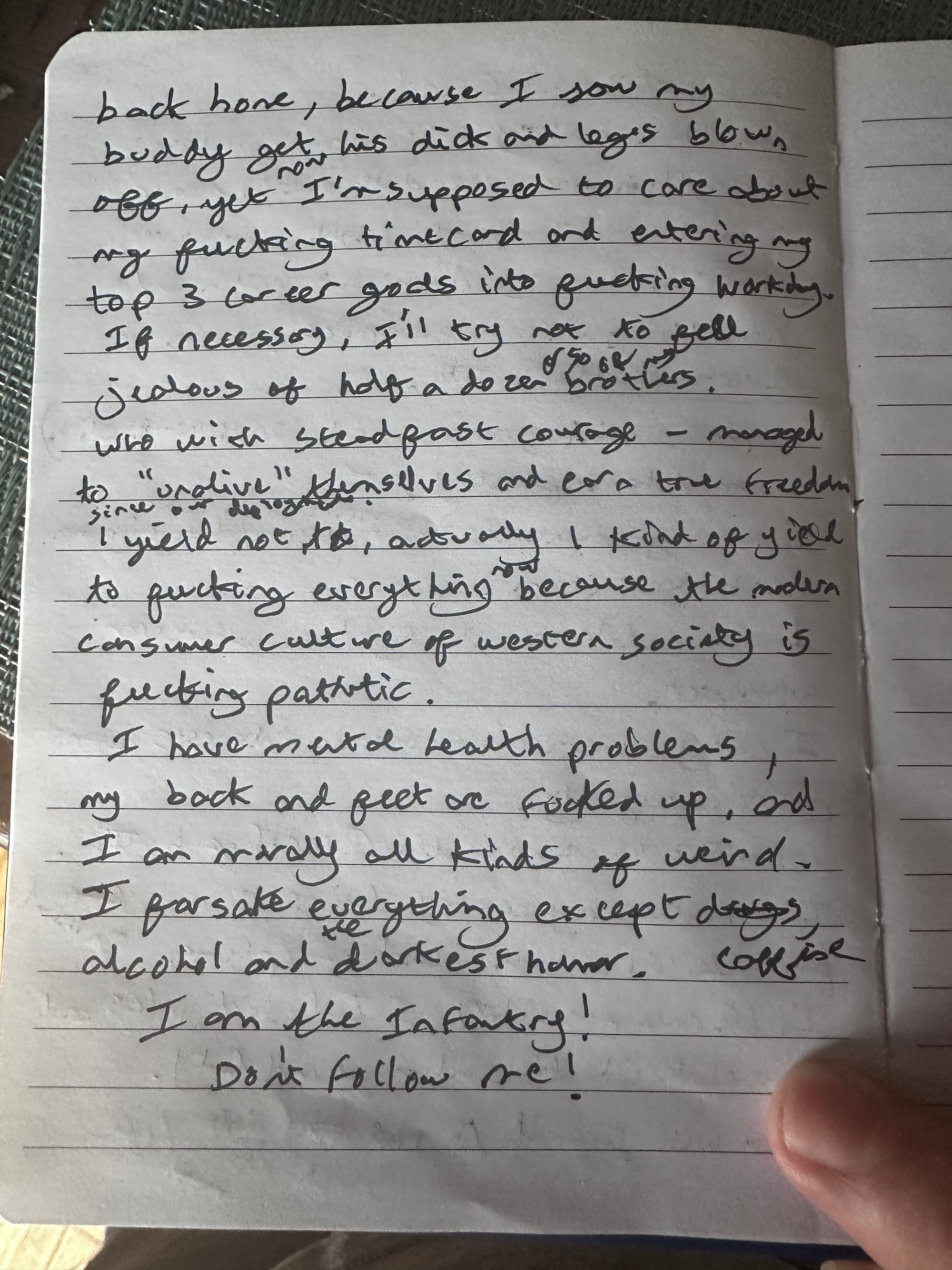 Never will I fail to suck at life back home, because I saw my buddy's dick and legs get blown off, yet I'm supposed to care about my timecard and entering my top 3 career goals for 2026 into fucking WorkDay.